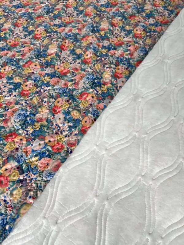 Savybės: striukinis audinys su sintepono pašiltinimu, prasiūtas siūlėmis, gėlių rašto. Paviršius mažai blizgus (beveik matinis). Audinys plonas, tačiau šiltas, tinkamas lengvų pavasario ir rudens striukių bei paltų siuvimui.