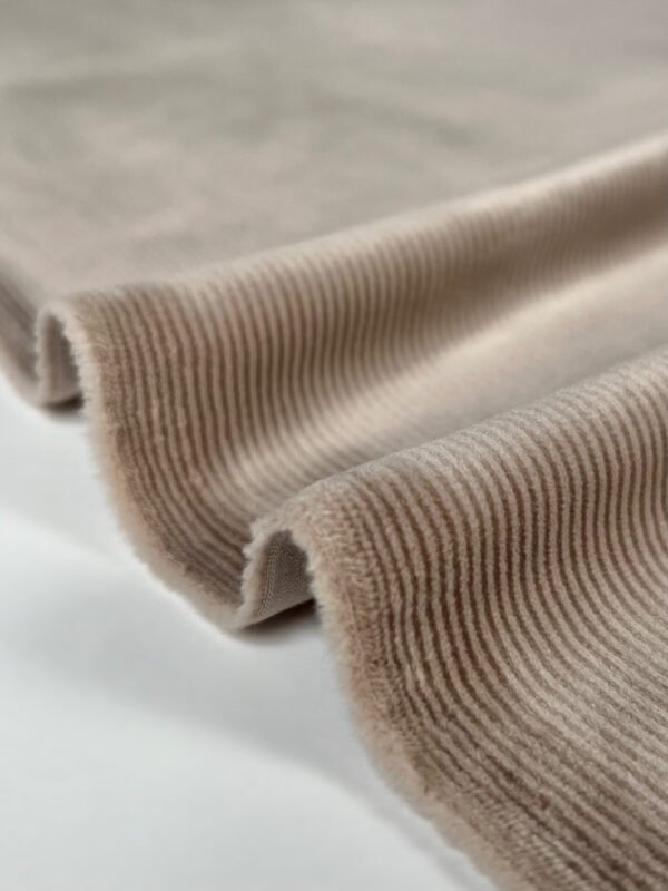 Savybės: vidutinio storumo, minkštas, tamprus soft veliūras, trikotažinio pagrindo, plonų juostelių rašto (raštas į ilgį). Trikotažas malonus liesti, turi švelnią trumpų plaukelių struktūrą, kuri suteikia medžiagai ypatingą blizgesį ir minkštumą. Soft veliūras yra labai malonus prie kūno ir patogus dėvėti, todėl yra yra puikus pasirinkimas kasdienių patogių laisvalaikio drabužių siuvimui.